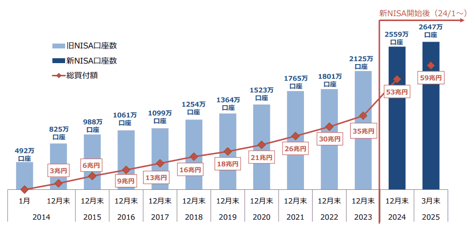 実際に2024年の新NISAの開始とともに、NISA口座の開設数は年々増えている!