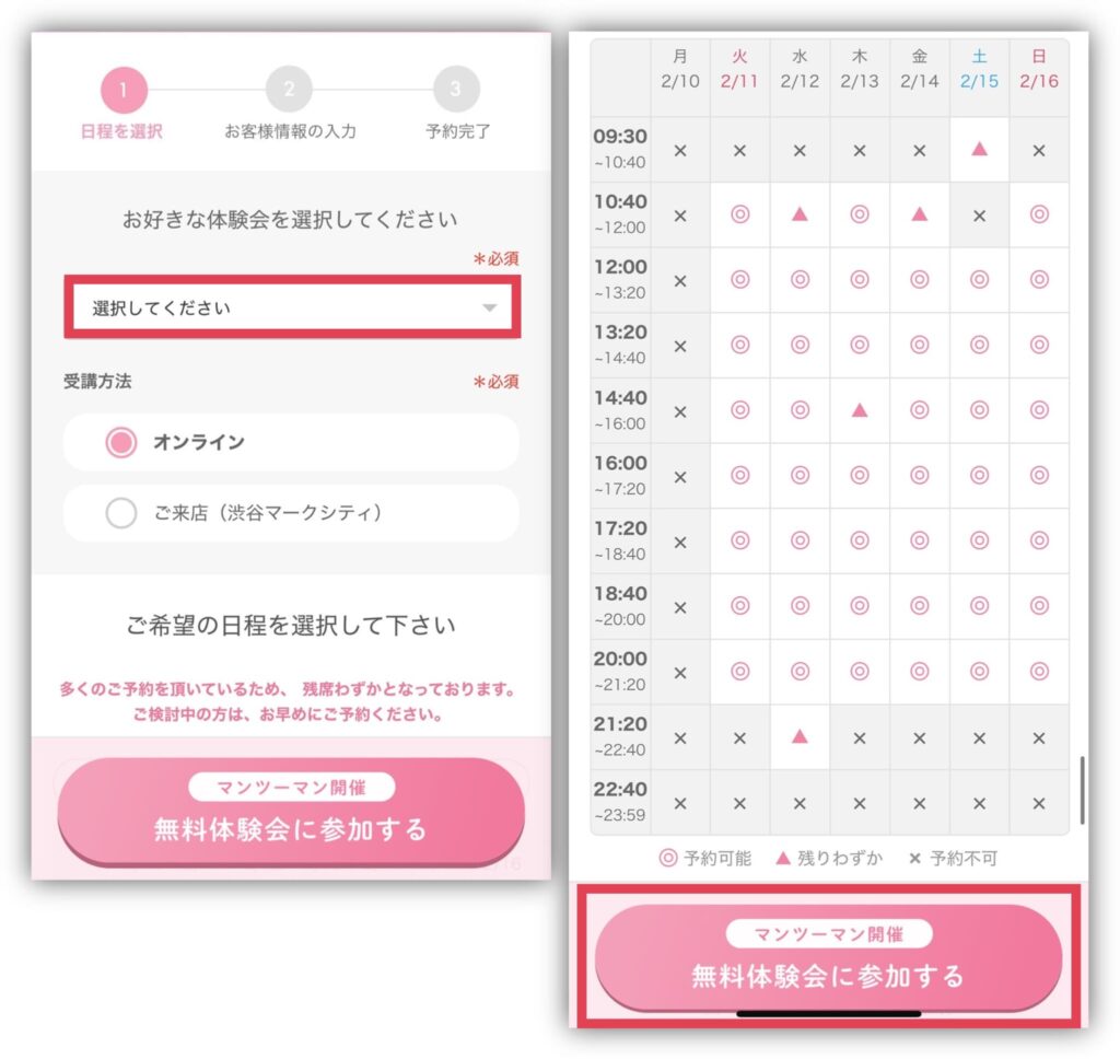 都合がいい日程を選択して、「無料体験会に参加する」をタップしてね。
