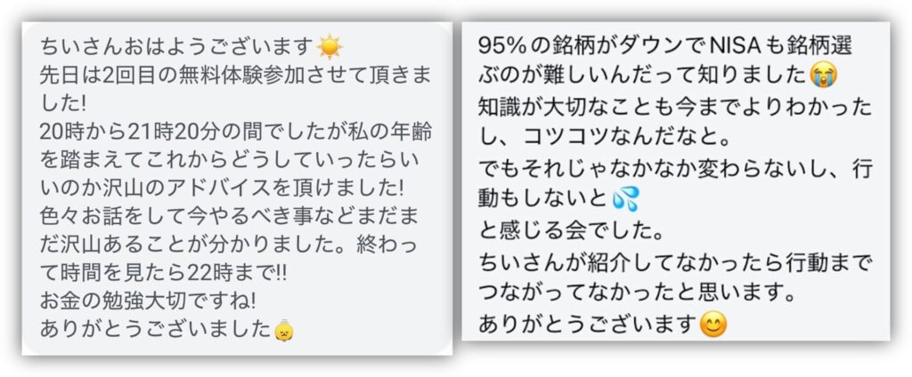次に、無料体験を受けたフォロワーさんからの口コミも集めたから紹介するね!