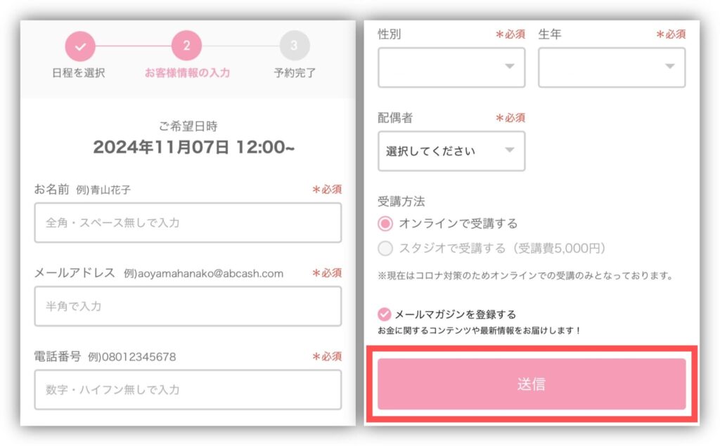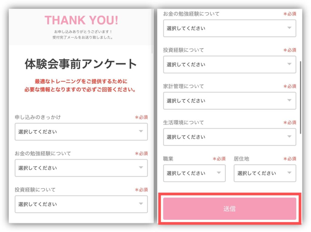 送信が完了すると体験会事前アンケートが表示されるから、すべての質問に回答してね✊