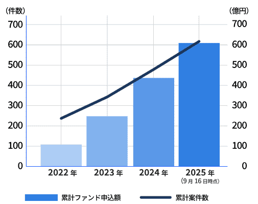 ファンド申し込み額と案件数も年々増えていて、2025年9月時点で累計ファンド申し込み額600億円、案件数600件を突破✨