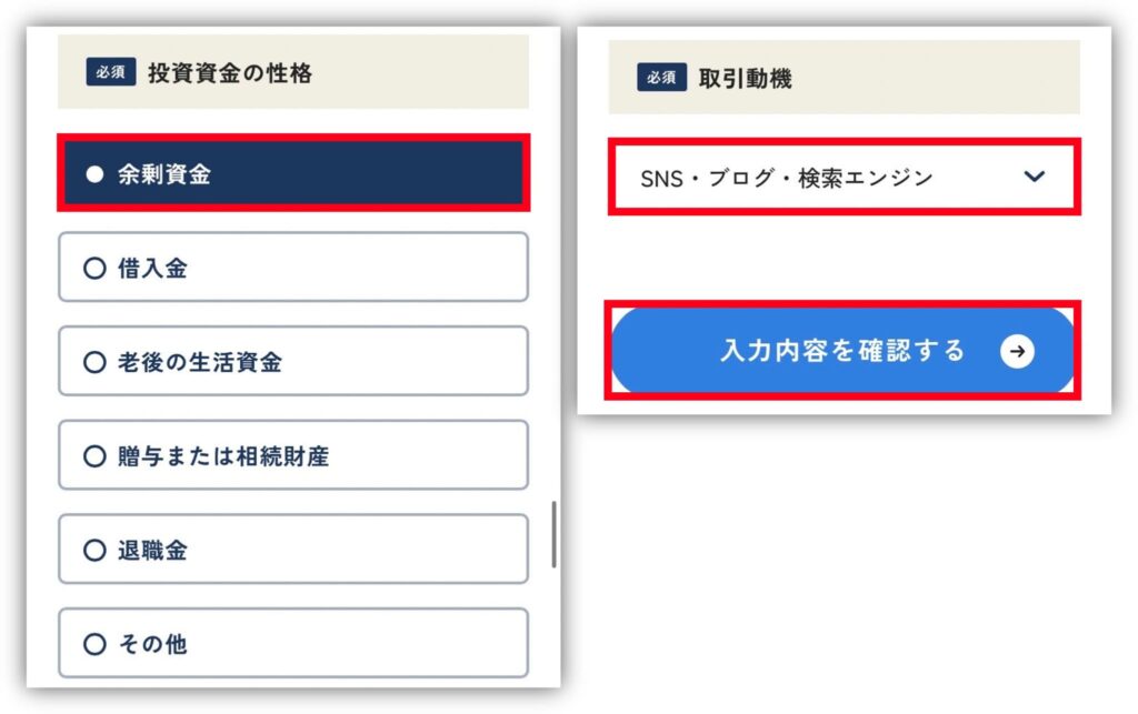 「投資資金の性格」と「取引動機」を選択したら、「入力内容を確認する」をタップするよ!