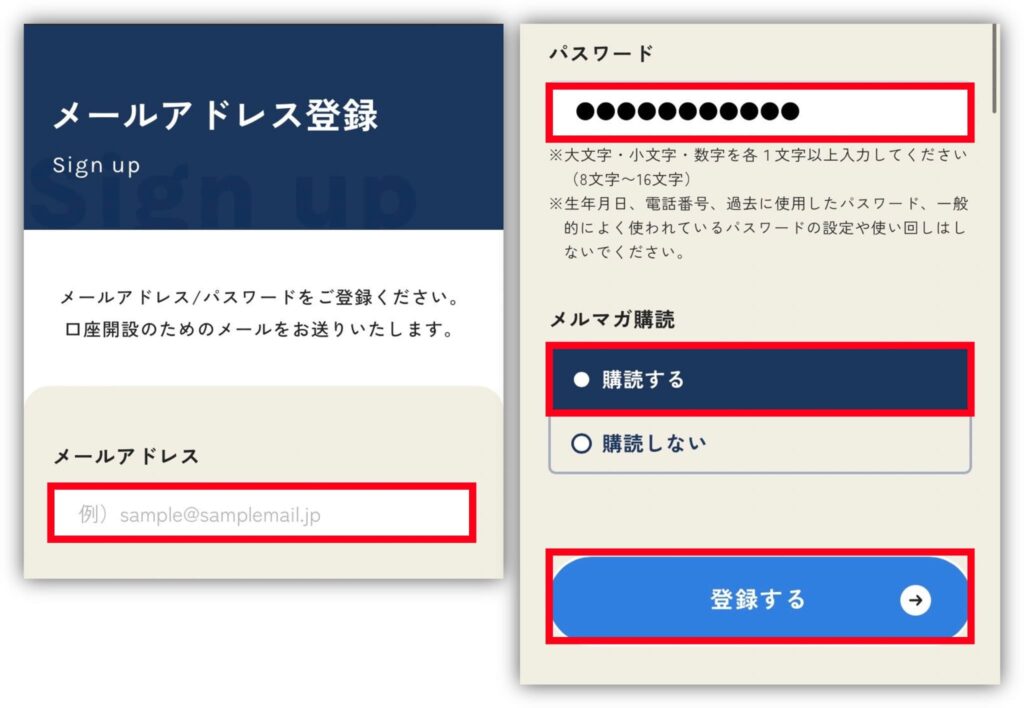 「メールアドレス」と「パスワード」を入力してね。