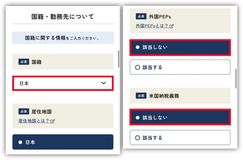 外国PEPsと米国納税義務は、ご自身に該当するものを選択してね。