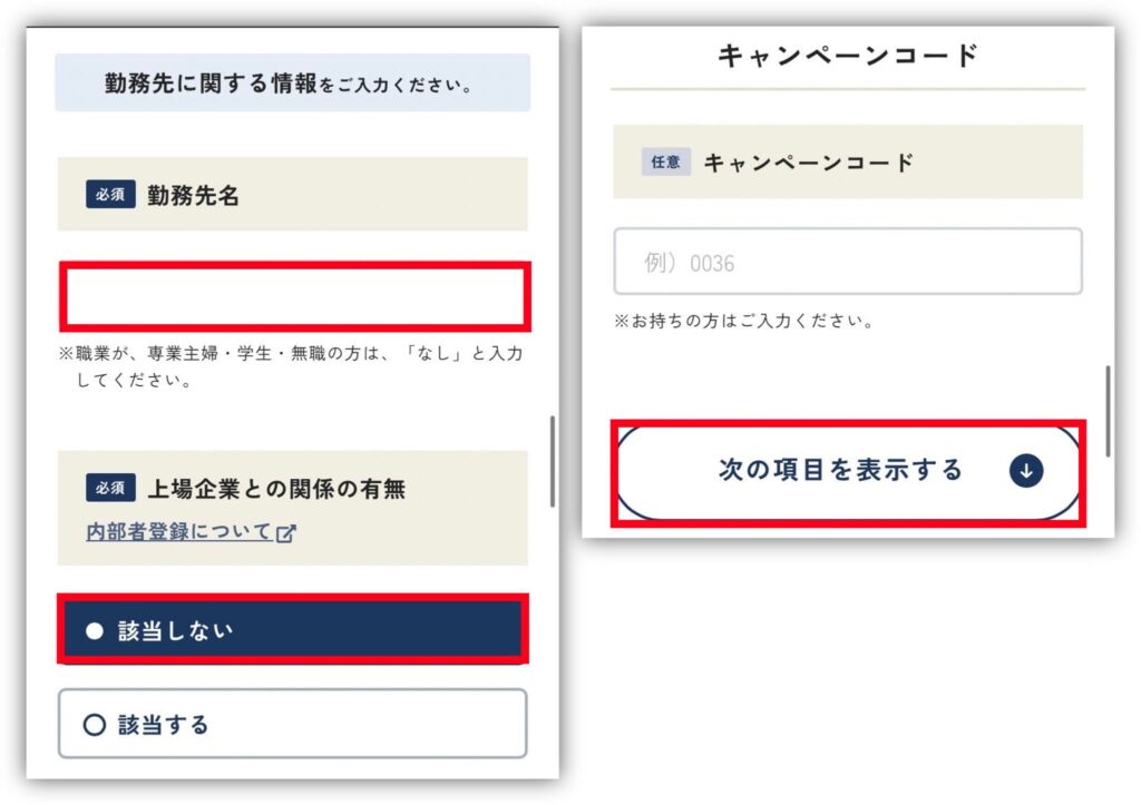 「勤務先名」と「上場企業との関係の有無」を入力してね!