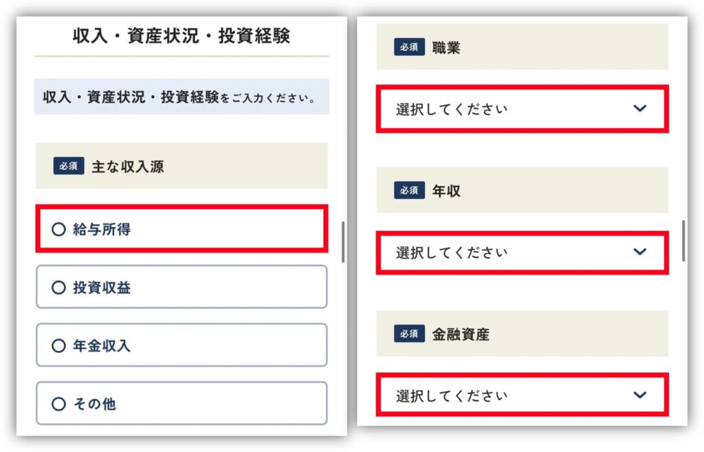「投資・取引経験」と「投資目的」を選んでいくよ😍