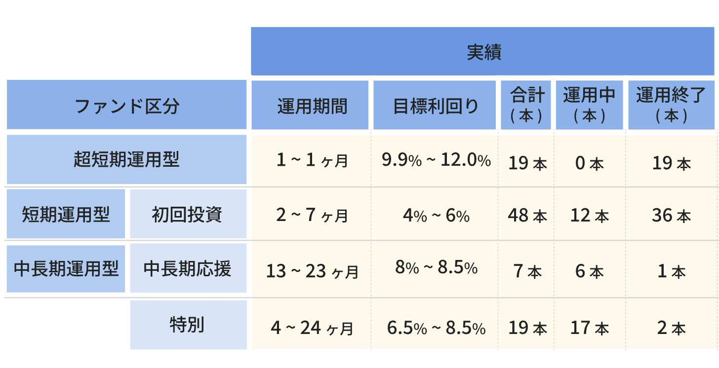 運用期間の違いによるファンド区分や目標利回りは、このようになっているよ(2025年8月末時点)!