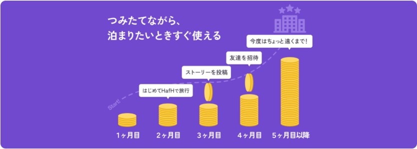 HafH(ハフ)とは、毎月の積立で貯めたコインを使って、ホテルや航空券を予約できる「つみたて旅行サービス」だよ✊