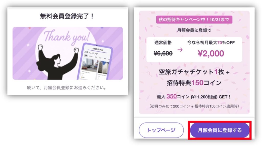「無料会員登録完了!」の画面が表示されたら、「月額会員に登録する」をタップしよう💛