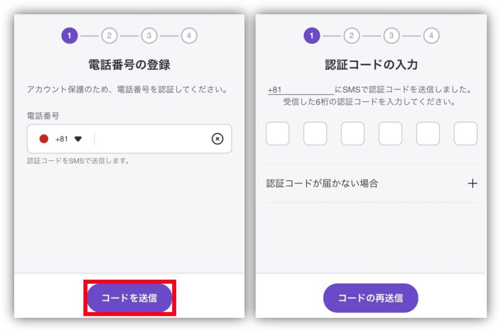 まず電話番号を入力し「コードを送信」をタップ✨