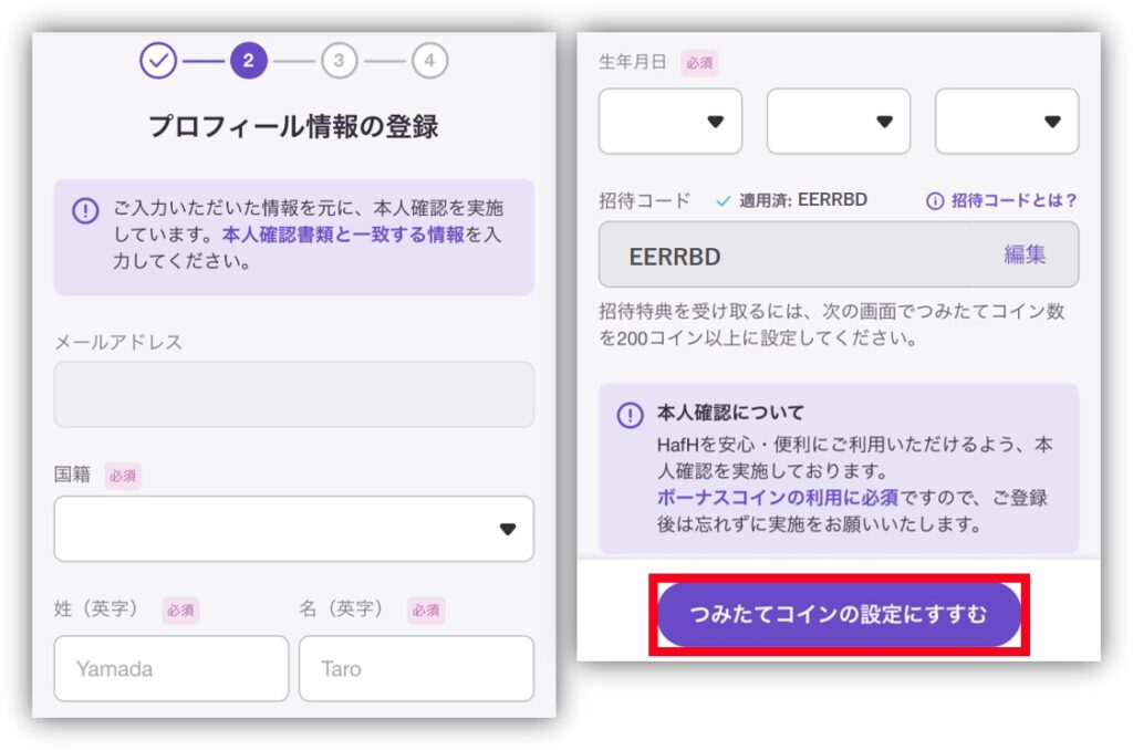 国籍を選び、氏名、生年月日、招待コードを入力しよう!