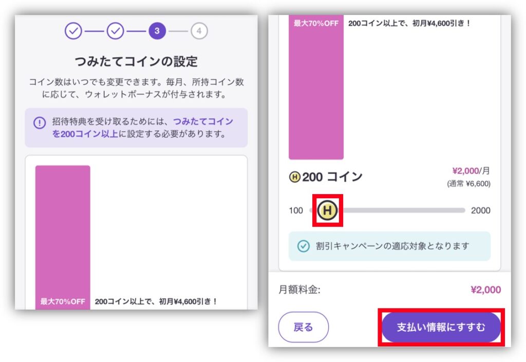 2025年秋の招待キャンペーンでは、200コインに設定すると初月は4,600円割引されたよ😍