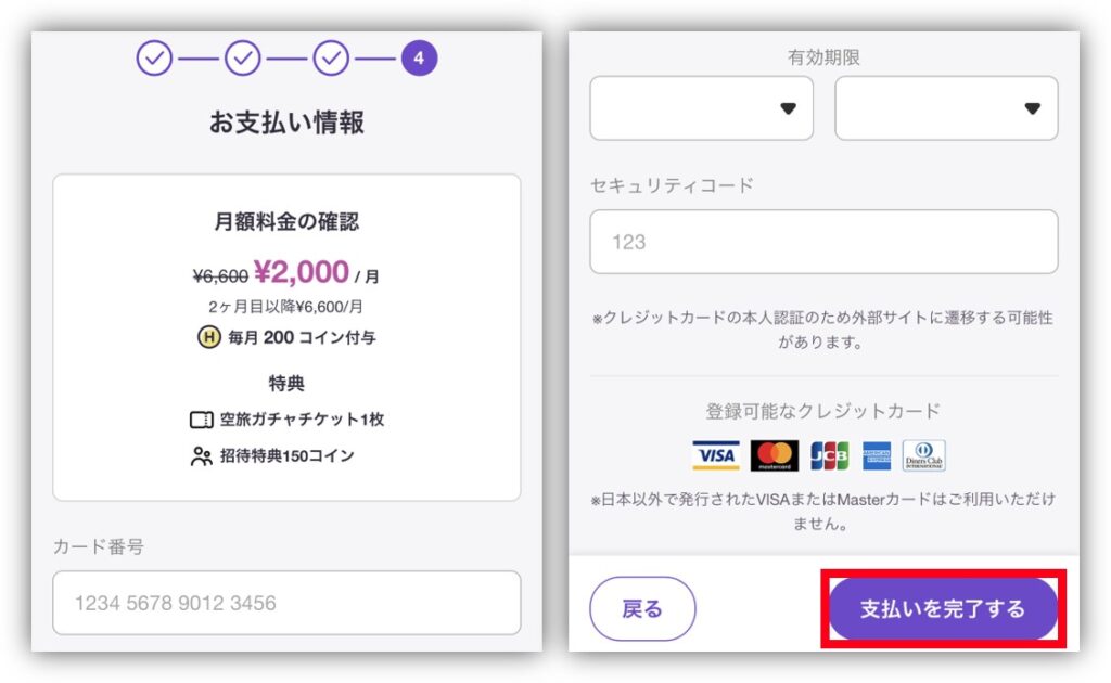 クレジットカードの情報を入力し「支払いを完了する」をタップしよう!