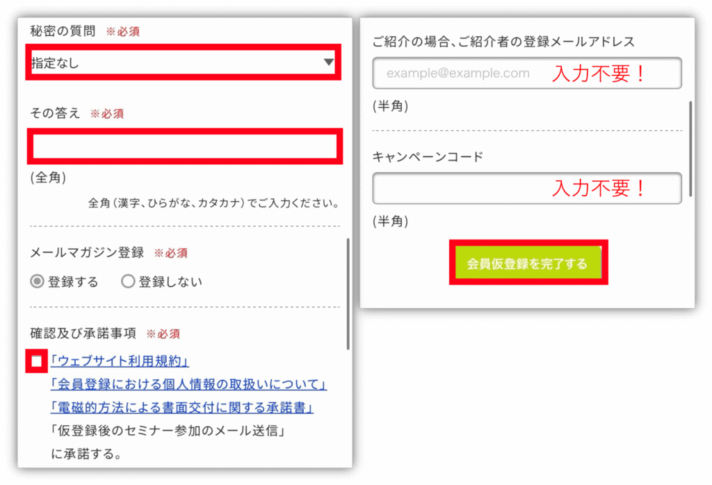 紹介者のメールアドレスやキャンペーンコードの入力がありますが、ここは「入力不要」だよ!