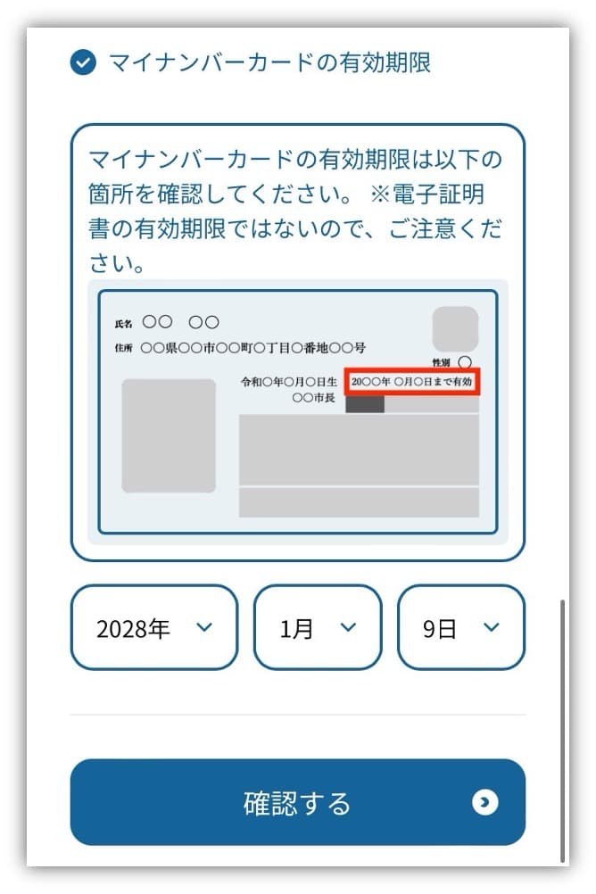 マイナンバーカードの有効期限を入力したら、「確認する」をタップ!